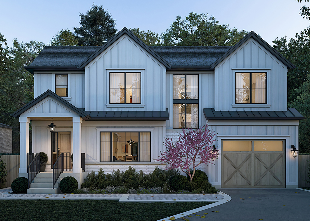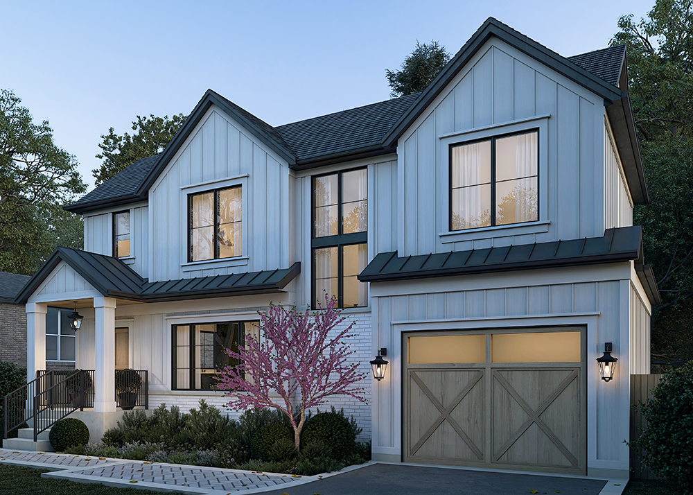 he reimagined layout expands the home’s footprint while improving flow, functionality, and natural light throughout the primary living spaces. The ground floor was carefully reworked to create stronger connections between the kitchen, family room, and outdoor areas, supporting everyday living and effortless entertaining. Strategic additions and interior planning allow the home to feel both open and efficient, with each space intentionally scaled for comfort and usability. On the exterior, layered gables and a balanced built form establish a timeless streetscape presence. Vertical board-and-batten siding, black-framed windows, and warm wood accents introduce depth and contrast, creating a modern farmhouse expression that feels both elevated and welcoming within the surrounding neighbourhood. The result is a cohesive transformation that respects the character of the existing home while delivering a fresh, contemporary identity.