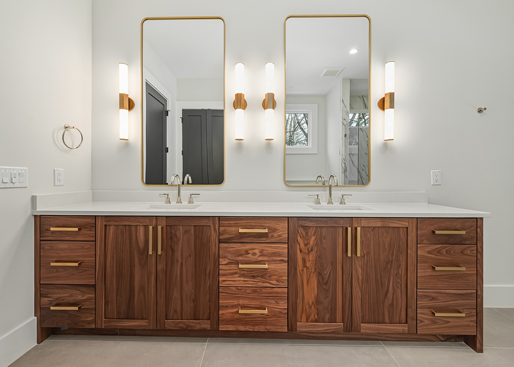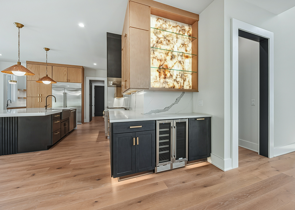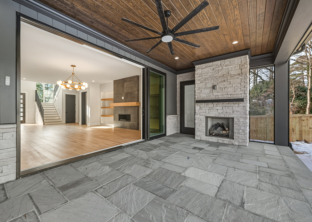 Characterized by a traditional gable roof adorned with shed dormers, the home boasts large modern windows that flood the interiors with natural light. Complementing these features are flat roofs and natural stone accents, adding a touch of contemporary sophistication. Project Northwood serves as an example of how the thoughtful integration of architectural styles can result in a home that is both modern and timeless, setting a new standard for forward-thinking design.